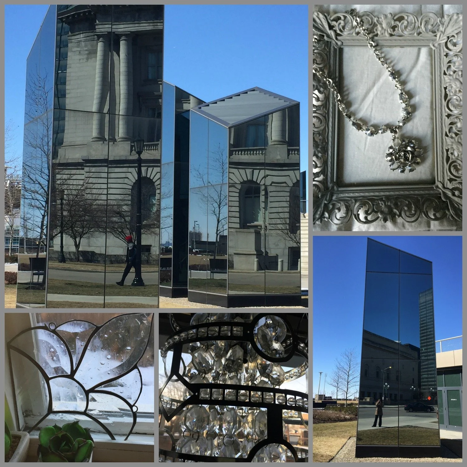 Every good design starts with inspiration. All of these designs are inspired by reflections. I decided to find as many objects as I could in one day that were designed based on this single concept. Innovation often starts with a small concept and grows into something greater. Take your every day world, and notice how many things you may have not noticed before that are based on a single concept that grew into an innovative design: a necklace . . . a glass window insert . . . a chandelier . . . a park monument. And, just for fun, you will see me in the photo in the lower right corner, shooting my picture of these stunning monuments under clear blue skies. #reflections #designoftheday